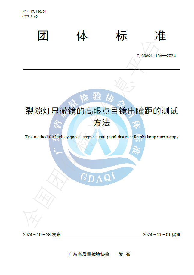 近日,由yl23455永利华通威主导起草的团标T/GDAQI 156—2024《裂隙灯显微镜的高眼点目镜出瞳距测试要领》,经全国团体标准信息平台正式宣布生效。